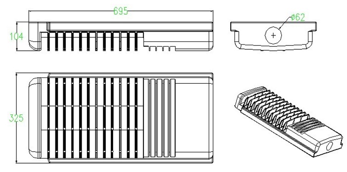 2) 灯体为铝合金压铸成型,散热鳍片,坚实耐用;