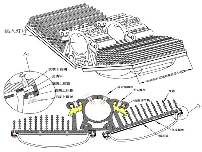2) 灯体为拉伸铝一体成型,散热鳍片,坚实耐用;