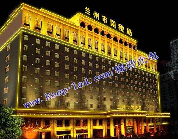 兰州国家税务局交付调试大楼亮化工程,此工程多选择应用了LED大功率点光源,实现光均匀性强,柔和型完美,体现出大楼的风格,其次选用LED数码管作围边,楼底采用LED大功率投光灯,楼顶采用LED大功率洗墙灯,让大楼整体呈现在太阳色中,实现大楼的大气;