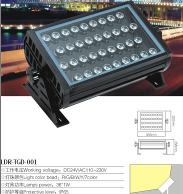 | LED投光灯说明: 又名LED聚光灯、LED投射灯、LED射灯。LED投光灯通过内置微芯片的控制,在小型工程应用场合中,可无控制器使用,能实现渐变、跳变、色彩闪烁、随机闪烁、渐变交替等动态效果,也可以通过DMX的控制,实现追逐、扫描等效果。。 LED投光灯介绍: